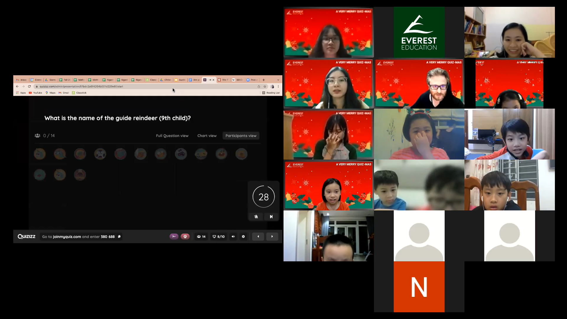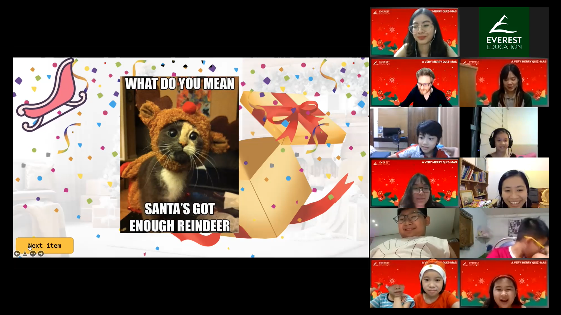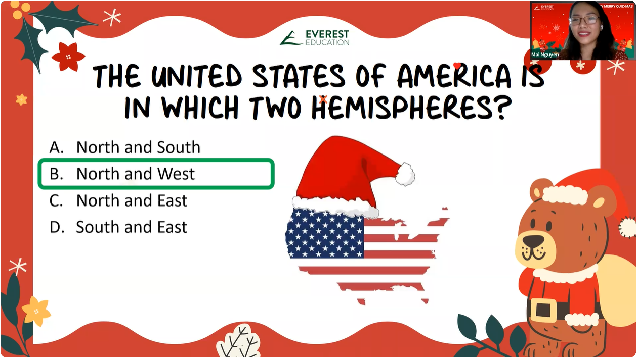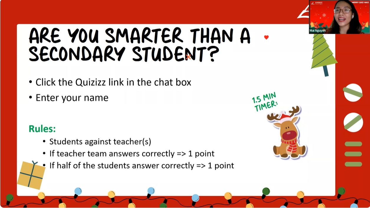 A VERY MERRY QUIZ-MAS is a Christmas-themed online event for E2 climbers only! With their friends and teachers, students will engage in various interactive activities, challenges, and Christmas games.
