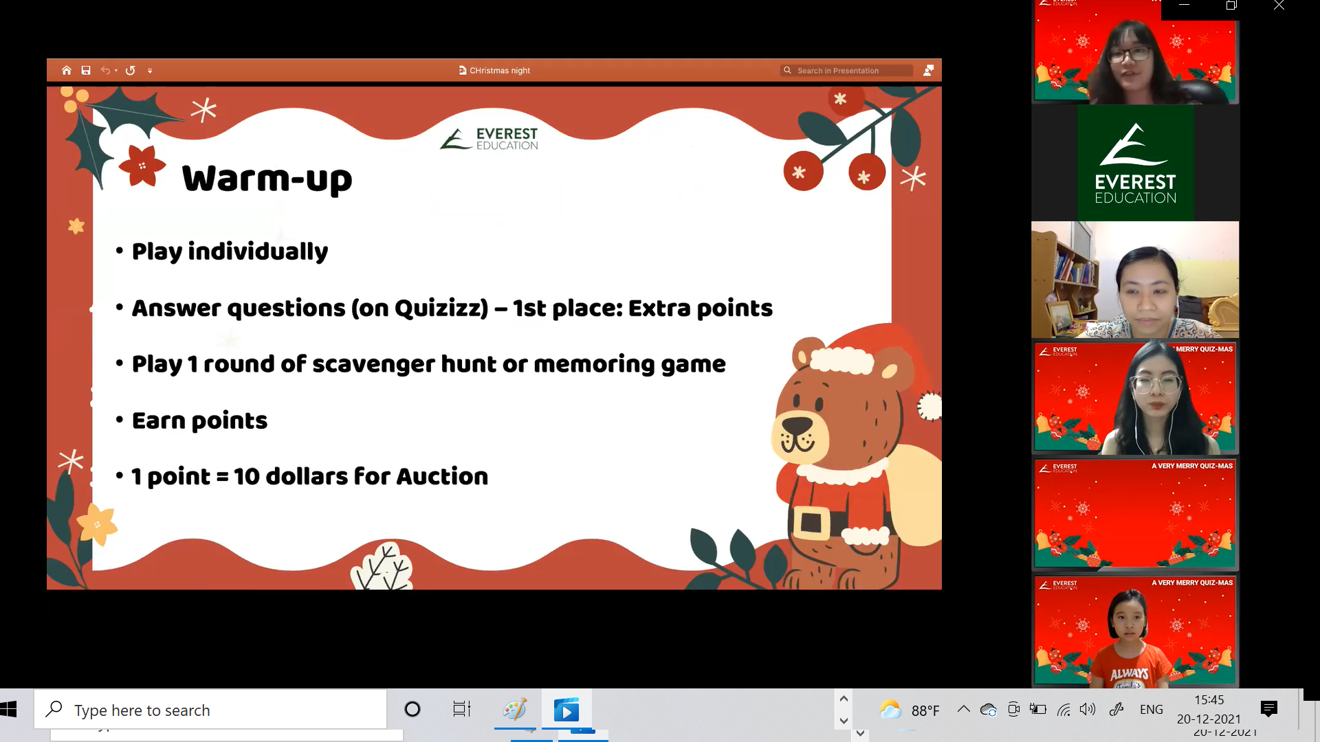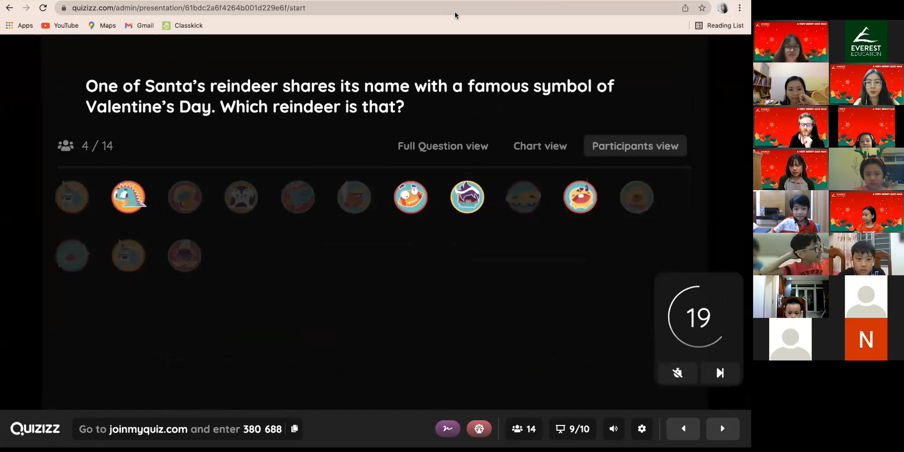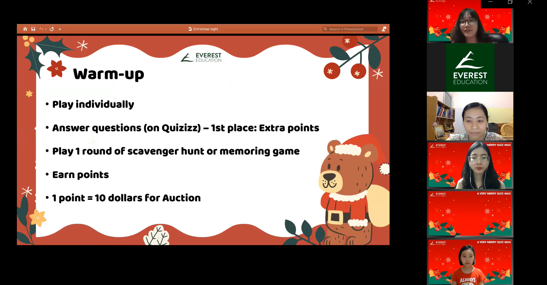 A VERY MERRY QUIZ-MAS is a Christmas-themed online event for E2 climbers only! With their friends and teachers, students will engage in various interactive activities, challenges, and Christmas games.